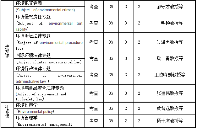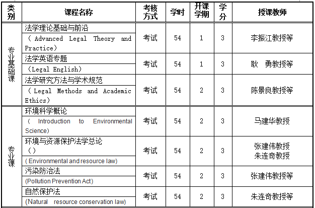 环境与资源保护法学(030108) Environmental Law 一、学科简介 环境与资源保护法学是法学一级学科下设的十大二级学科之一,是为了应对环境问题的日趋严重而发展起来的新兴部门法学。与传统部门法学不同,环境与资源保护法学是随着环境科学的产生与发展并逐渐与法学相融合而产生和发展起来的,具有明显的自然科学和社会科学交叉渗透的特点。当今,可持续发展已成为各国的发展战略,在推进这一战略的过程中,环境与资源保护法起着十分重要的作用,基于此,环境与资源保护法学发展迅猛。在中国,伴随着生态文明建设的深入开展,环境与资源保护法学现已成为法学的核心课程,近年来其学科发展越来越受到重视,研究领域不断在拓展,社会对其人才需求不断在增加。我校环境与资源法学学科,具有复合型的师资队伍,依托综合优势,积极参与地方经济社会发展的协同创新,国际化程度不断提高,在省内和国内的影响力日益增强。 二、研究方向 1.污染防治法:研究污染防治法的基本理论和概括性的法律制度安排,以及大气污染法、水污染防治法、土壤污染防治法、固体废物污染防治法、环境噪声污染防治法、放射性物质污染防治法等具体内容。 2.自然保护法:研究自然保护法的基本理论和概括性的法律制度安排,以及水法、森林法、草原法、野生动植物保护法、自然保护区法、矿产资源法、土地管理法等具体内容。 三、培养目标及基本要求 培养目标:热爱祖国,坚持四项基本原则,忠于法律,系统掌握环境与资源保护法学理论,了解环境科学等相关知识,能够解决环境法治建设中的现实问题,具有良好法律意识和法律职业道德的高层次复合型人才。 基本要求: 1.掌握马克思列宁主义、毛泽东思想、邓小平理论、“三个代表”和科学发展观,热爱祖国,遵纪守法,品行端正。 2.系统掌握环境与资源保护法学理论,了解环境科学等相关知识,能够理论联系实际,解决环境法治建设中的各种问题,具备创新能力和实务操作能力。 3.掌握一门外语,能够熟练阅读本专业外文资料。 4.能够熟练使用计算机。 5.身体健康。 四、招生对象 具有国民教育序列大学本科/专科学历(或本科同等学力)人员。 五、学习形式与年限 全日制,学制一般为3年。 六、课程设置