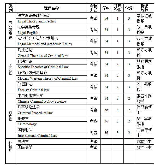 刑法学(030104) Criminal Law 一、学科简介 刑法学是研究刑法及其所规定的犯罪和刑事责任的科学。它属于部门法学的范畴,是部门法学中最重要的学科之一。对该学科展开深入、系统地研究,不仅可以为法学工作者和法律工作者提供理论指导,而且也对法学的进一步繁荣发展具有重要意义。 新中国刑法学同新中国刑法立法及司法一样,经历了近60多年的艰难曲折的发展过程。当前,我国刑法学研究蓬勃发展,研究的广度和深度都达到了空前的水平,是部门法学中最成熟的学科之一。该学科的优势是:该学科是法学省级重点学科中的重要二级学科之一,是河南大学最早经国务院审批通过的硕士点的学科之一,在国内具有一定影响,在省内居于前列;该学科共有10人组成,老中青相结合,其中教授2人,副教授7人,讲师3人,具有博士学位的6人,硕士学位的2人,多人具有国外留学经历;该学科牵头人是河南省教育厅学术技术带头人,可谓师资力量雄厚;该学科科研力量强,近年来承担国家社科基金项目2项、省部级项目多项,在核心期刊发表论文几十篇,出版学术著作多部,获得省部级社科优秀成果奖多项。该学科的特色是:以中国刑法为主要研究方向,同时辐射外国刑法、犯罪学和国际刑法等方向,一方面从刑法的整体构成及文化精神的多维视界来探讨中国刑法的特质及递嬗规律;另一方面对处于不同法文化环境中的中外刑法理论进行比较研究,力求通过探讨中外刑法理论的一系列根本问题,来具体阐释刑法理论的深层次蕴含。本学科的上述发展现状及学科优势和特色,为该学科建设和研究生培养奠定了坚实的基础。 二、研究方向 1.中国刑法 2.外国刑法 3.犯罪学 4.国际刑法 三、培养目标及基本要求 掌握马列主义、毛泽东思想、邓小平理论和“三个代表”重要思想,坚持科学发展观,热爱祖国,热爱人民,品德优良,作风朴实,遵纪守法,自觉抵制不良倾向,积极为建设有中国特色社会主义的崇高事业服务。业务上以马列主义基本原则为指导,遵循科学发展规律,全面、系统地掌握本专业的基础理论和专业知识,至少掌握一门外语,能比较熟练地阅读和翻译有关专业的外文资料,具有能够独立从事刑事立法、司法工作和刑法学教学、科研工作等的高级法学人才。 四、招生对象 具有国民教育序列大学本科或者专科学历(或本科同等学力)的人员。 五、学习年限和学习方式 全日制学习年限为三年。第一学期主要学习公共学位课(学位英语和政治理论)和专业基础课;第二学期主要学习公共学位课(学位英语)和专业课;第三学期主要学习专业课和选修课(方向课);第四学期进行中期检查环节,同时进行专业实践(科学研究实践)和学位论文的开题工作;第五、六学期主要进行学位论文的写作和答辩工作。 六、课程设置