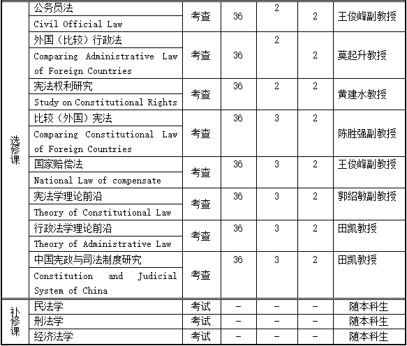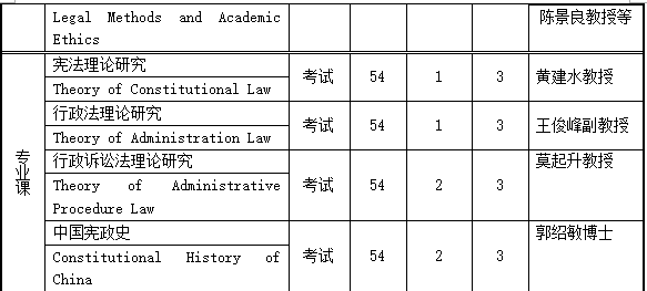 宪法学与行政法学(030103) Constitution and Administrative Law 一、学科简介 宪法与行政法是我国法律体系中最重要的法律部门。宪法学是以宪法和宪法现象为研究对象的法律学科,通过对宪法的基本理论和基本原则、公民基本权利和义务以及国家机构和国家制度、宪政实践及其规律等问题的研究,为一切国家机关、政党、其他社会组织以及公民个人的社会活动、其他部门法制建设提供理论指导。行政法是宪法最重要的实施法。行政法学是以行政法基本理论和基本原则、行政法律规范和行政行为法制实践为主要研究对象的法律学科。它通过对行政法的理念、原则及制度和实践等问题的研究,为监督和维护行政机关依法行政,保护公民、法人和其他组织的合法权益提供理论指导。与公民权利意识的兴起、与国家对公民基本权利日益尊重与保障相呼应,对行政法的研究,应紧紧围绕行政权的行使和救济来进行。我校该专业特设置行政救济法方向。 二、研究方向 1.宪法学 2.行政法学 3.行政救济法 三、培养目标及基本要求 培养本学科德、智、体全面发展,具有坚实、广博的理论基础与系统、深入的专业知识,能够适应社会主义民主法制建设的需要,具有独立从事宪法与行政法教学研究和实际工作能力的法律人。具体要求是:具有坚实的法学理论基础、全面的宪法与行政法学知识和基本的政治学、哲学、历史学、社会学等人文社会科学知识;较为熟练地掌握一门外语,能阅读本专业的外文资料;具有良好的理论素养和抽象概括能力,具备独立从事宪法与行政法学理论研究以及从事有关教学、国家立法、司法、行政执法及相关律师实务工作能力。 四、招生对象 具有国民教育序列大学本科/专科学历(或本科同等学力)人员。 五、学习形式与年限 全日制学习年限一般为三年。第1—3学期为学位课程及其他课程学习时间;第4—6学期为教学与社会实践、学位论文开题与学位论文撰写和学位论文答辩时间。 六、课程设置