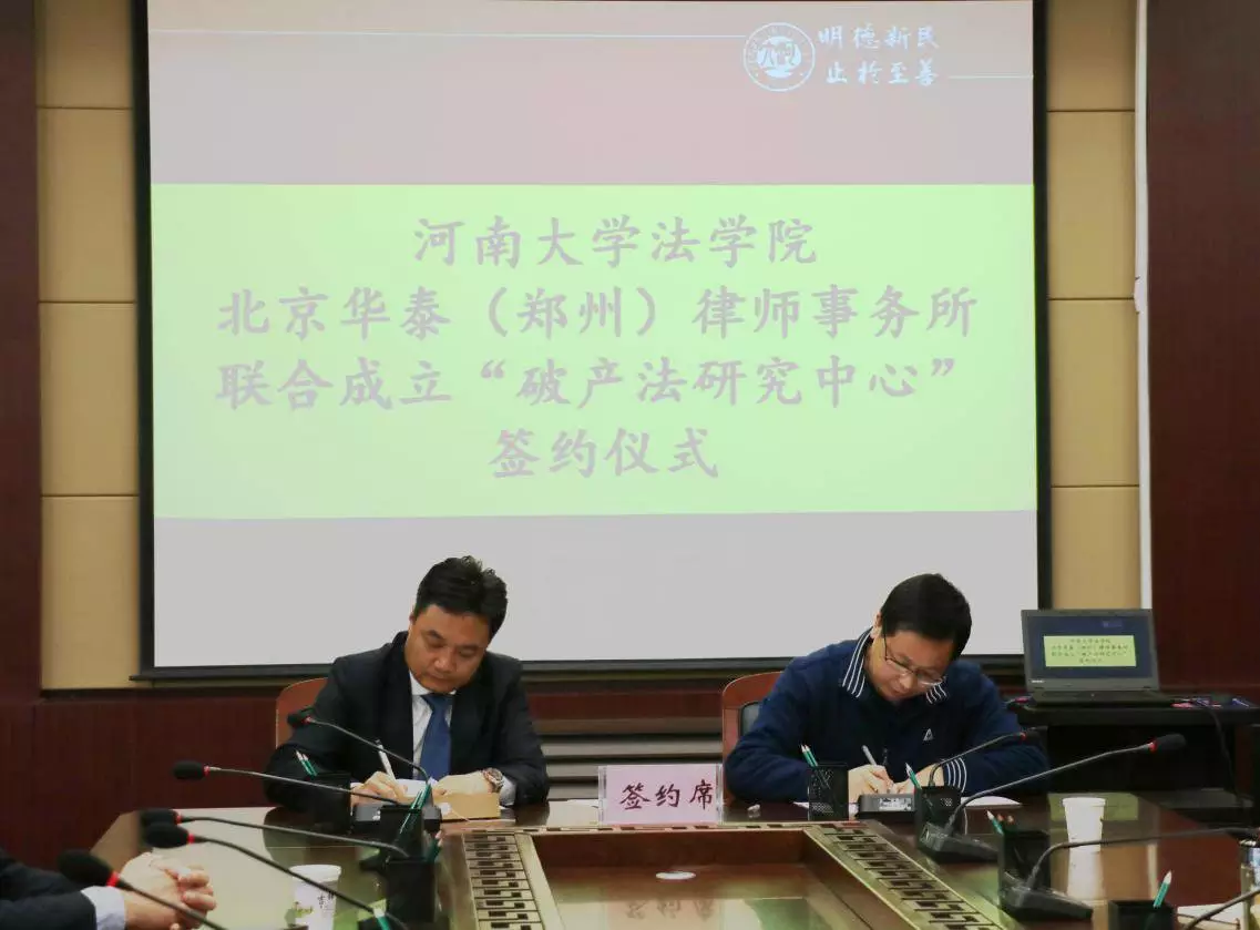 2017年10月20日上午,北京华泰(郑州)律师事务所与yl23455永利官网在yl23455永利官网举行了“破产法研究中心”签约仪式,双方合作成立“破产法研究中心”。