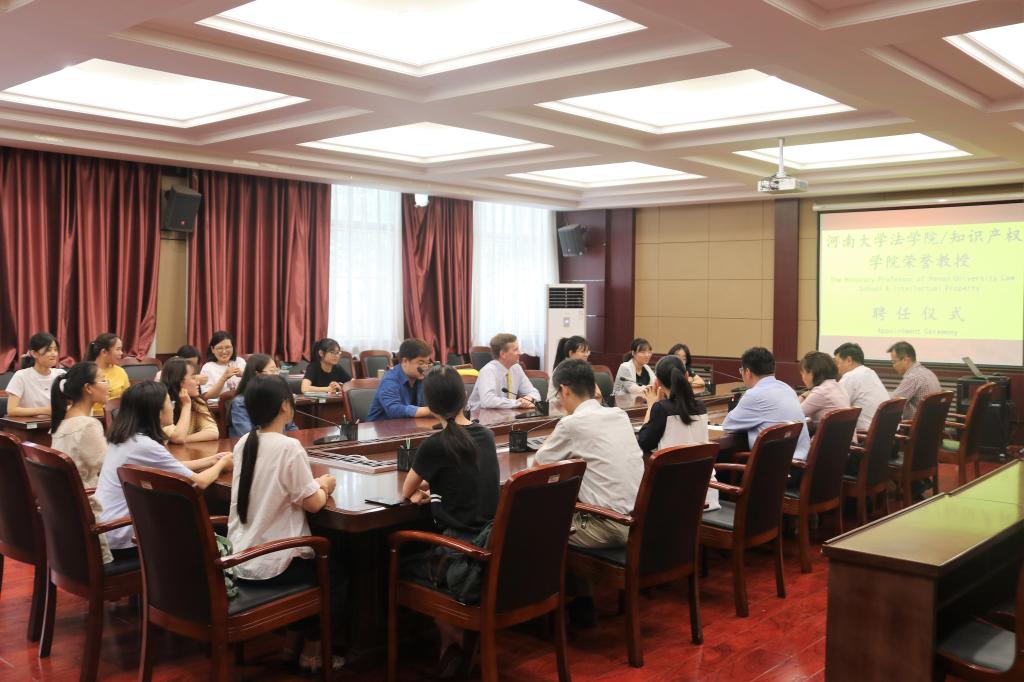 王桂为马修•威尔逊教授颁发聘任证书,并赠送其开封传统工艺品——汴绣。王桂代表学院向威尔逊教授对学院建设和学生培养所做出的贡献表示衷心的感谢。他在发言中谈到,威尔逊受聘yl23455永利官网荣誉教授,必将为学院的建设和发展注入新鲜血液,威尔逊教授在理论界和实务界积累的丰富经验,可以更好地指导和支持知识产权学科及相近学科的学生成长和成才,为我院应用型人才培养提供更为有力的支撑。