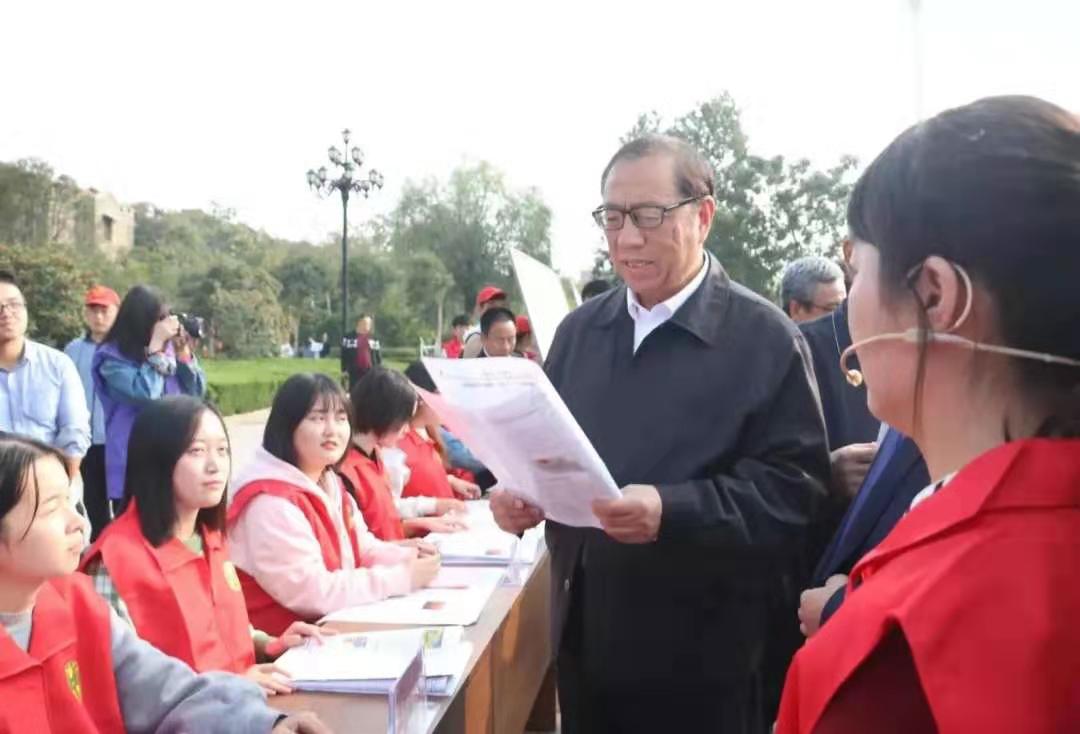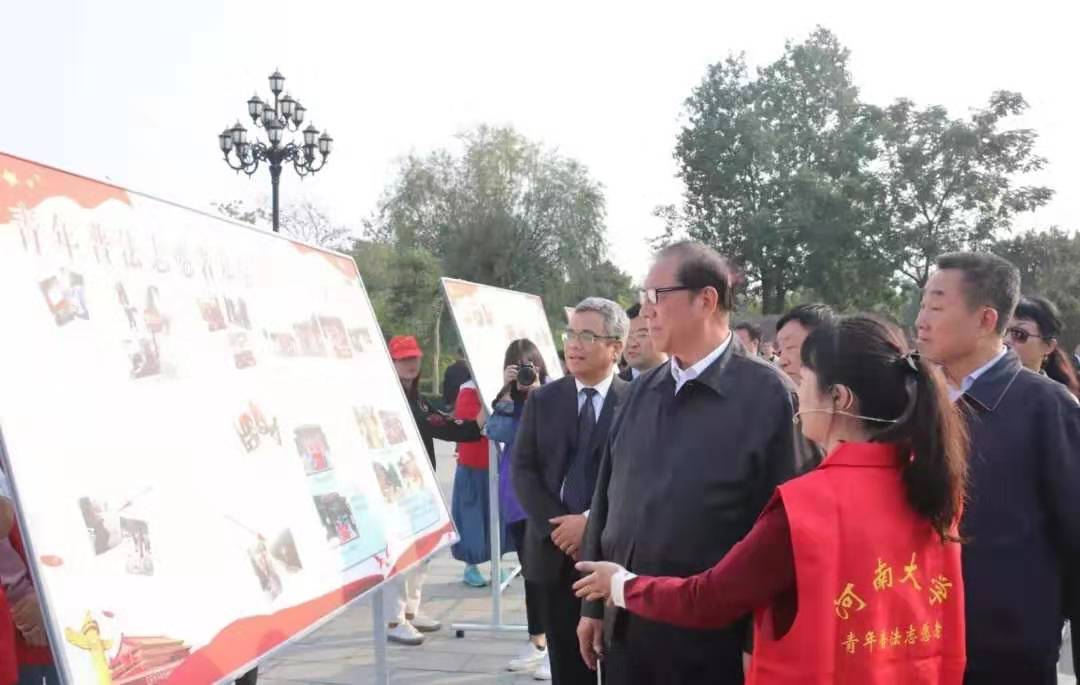 秋日暖阳下的河南大学,天高气爽,金菊绽放,一派勃勃生机。10月18日下午,全国人大常委会委员,全国人大监察和司法委员会副主任委员,中国法学会党组成员、副会长张苏军在河南省法学会会长刘满仓等省市领导的陪同下,来我校参观视察“青年普法志愿者法治文化基层行”活动成果,校党委书记卢克平,党委常委、副校长孙君健热情接待了来访领导,校党委办公室、保卫处、yl23455永利官网等相关部门负责人陪同考察。