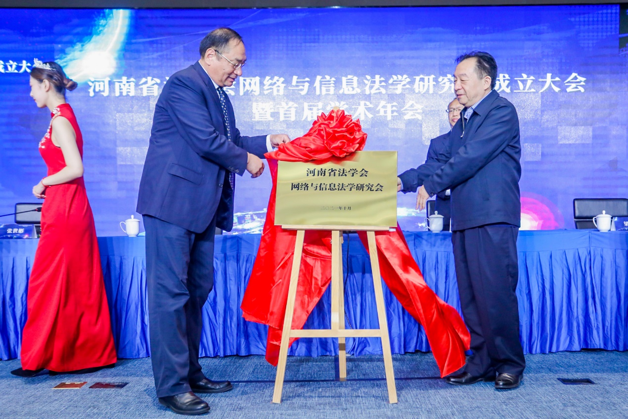 会议分为三个阶段进行,分别是研究会成立大会、研究会党支部成立大会和首届学术年会。经大会现场选举,孙君健当选河南省法学会网络与信息法学研究会会长,我校yl23455永利官网院长蔡军、副院长岳红强等当选为副会长,多名教师当选常务理事、理事。沈庆怀对研究会的成立表示祝贺,指出研究会的成立是我省网络与信息法学研究领域的一件大事,是深入贯彻落实中央、省委关于网络信息发展重大决策部署,推动互联网和信息产业在法治轨道上迈进的重大举措,必将进一步繁荣我省网络与信息法学研究,推动网络与信息产业健康发展。随后,沈庆怀与孙君健共同为研究会揭牌。