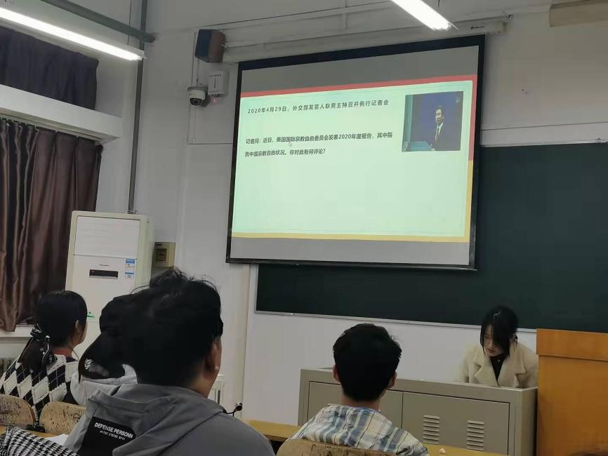 法学6班班长李孟阳通过演示文稿的形式,为同学们展示了我们国家的宗教政策:首先是旗帜鲜明地坚持教育与宗教相分离的原则、其次是共产党员不得信仰宗教,确保意识形态的纯洁性。强调了中国各种宗教不受外国势力的支配,实行独立自主、自办教会和自治、自养、自传的原则。 yl23455永利官网党委组织开展的本科2020级宗教教育活动大大提高了yl23455永利官网学子对宗教的科学认识,引导同学们牢固树立了科学的马克思主义宗教观,为校园宗教安全打下了坚实的知识、理论、思想基础。