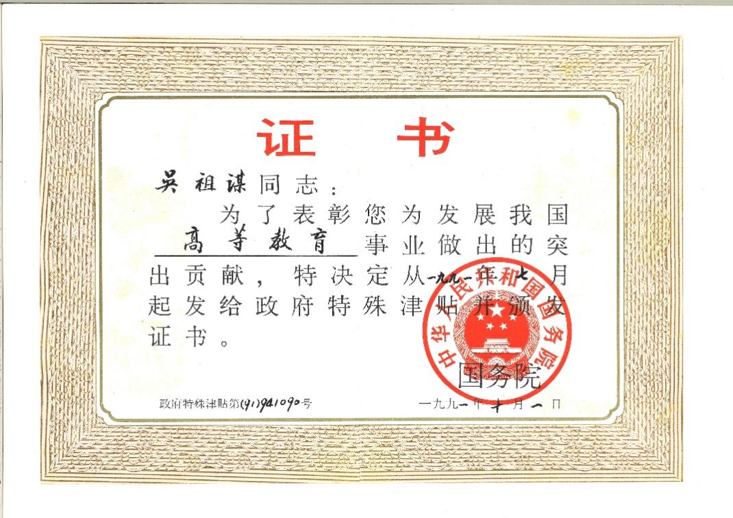 1991年,吴祖谋先生受国家表彰享受国务院特殊津贴,图为国务院颁发的证书。