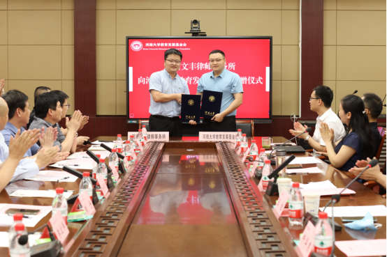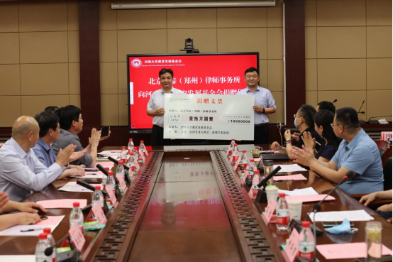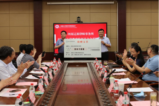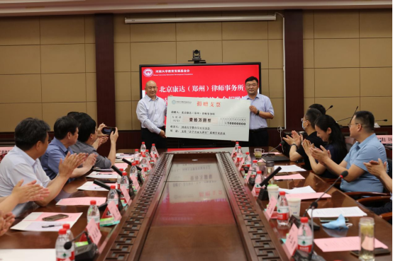 6月17日下午,河南文丰律师事务所、北京华泰(郑州)律师事务所、河南辽源律师事务所、北京康达(郑州)律师事务所向河南大学教育发展基金会捐赠仪式在yl23455永利官网第一会议室举行,四家律所每所捐赠10万元定向用于yl23455永利官网开办“文丰法学前沿大讲堂”“华泰法律实务大讲堂”“辽源明德法政大讲堂”“康达法学名家大讲堂”。河南大学党委常委、纪委书记、省监察委驻河南大学监察专员杨朝阳,四家律师事务所主任和律师代表,河南大学教育发展基金会副秘书长唐胜,yl23455永利官网领导班子成员和师生代表参加捐赠仪式。仪式由yl23455永利官网党委副书记吴瑷瑷主持。